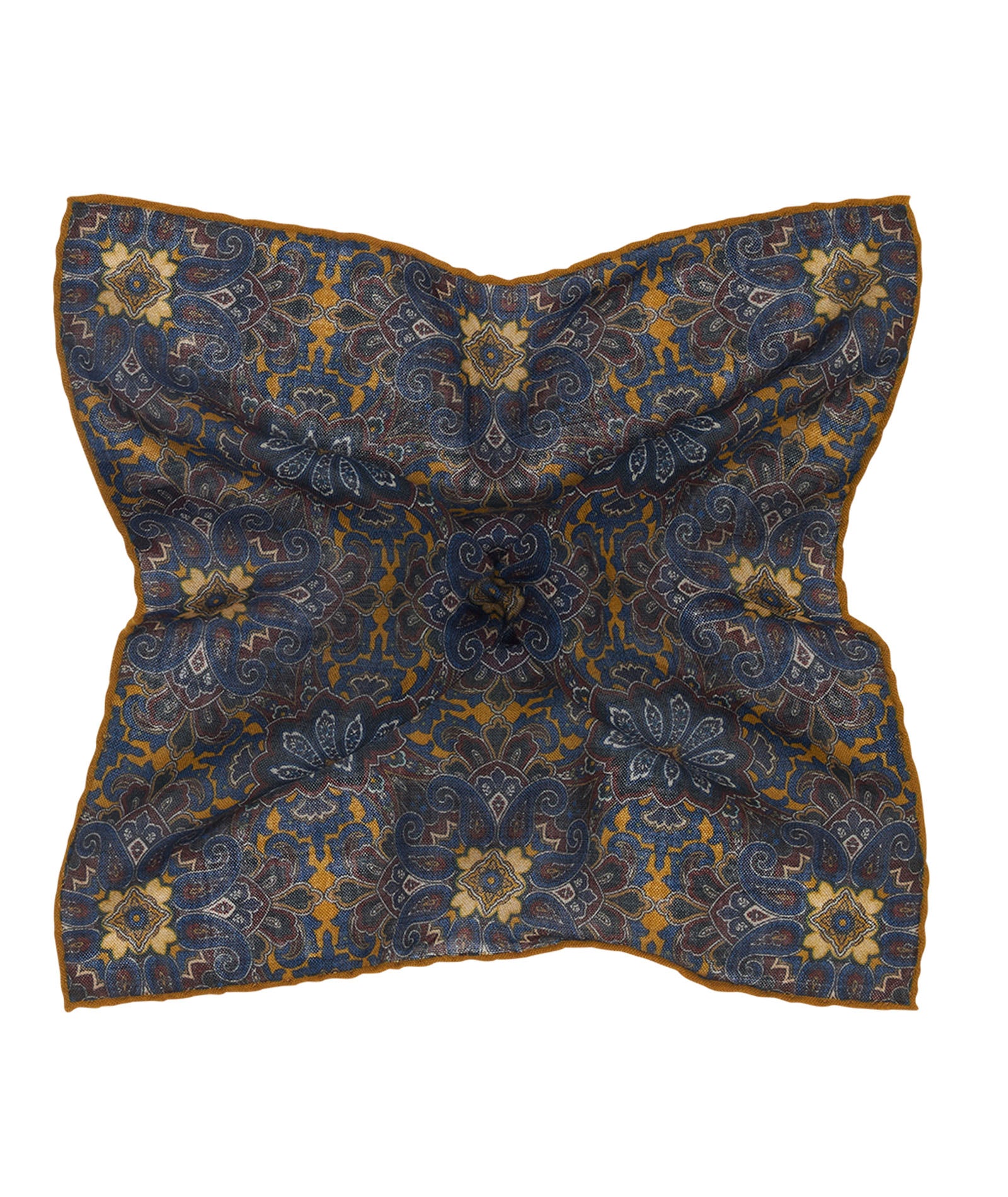 Wool pocket square with a paisley pattern in shades of brown, blue and yellow. A stylish complement to a blazer or a jacket.