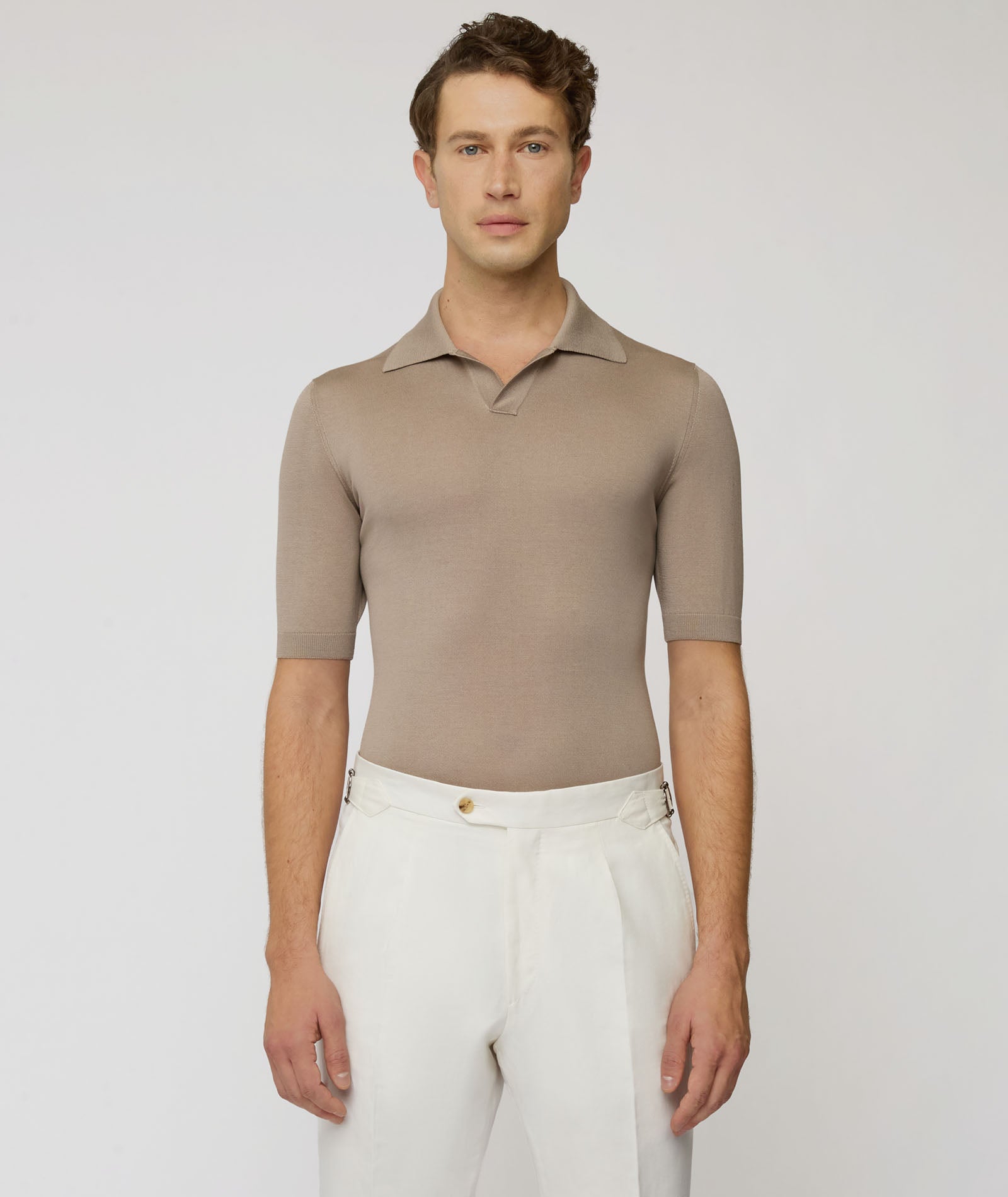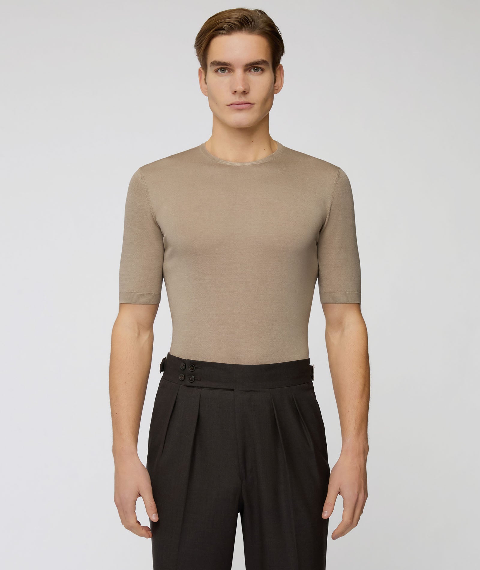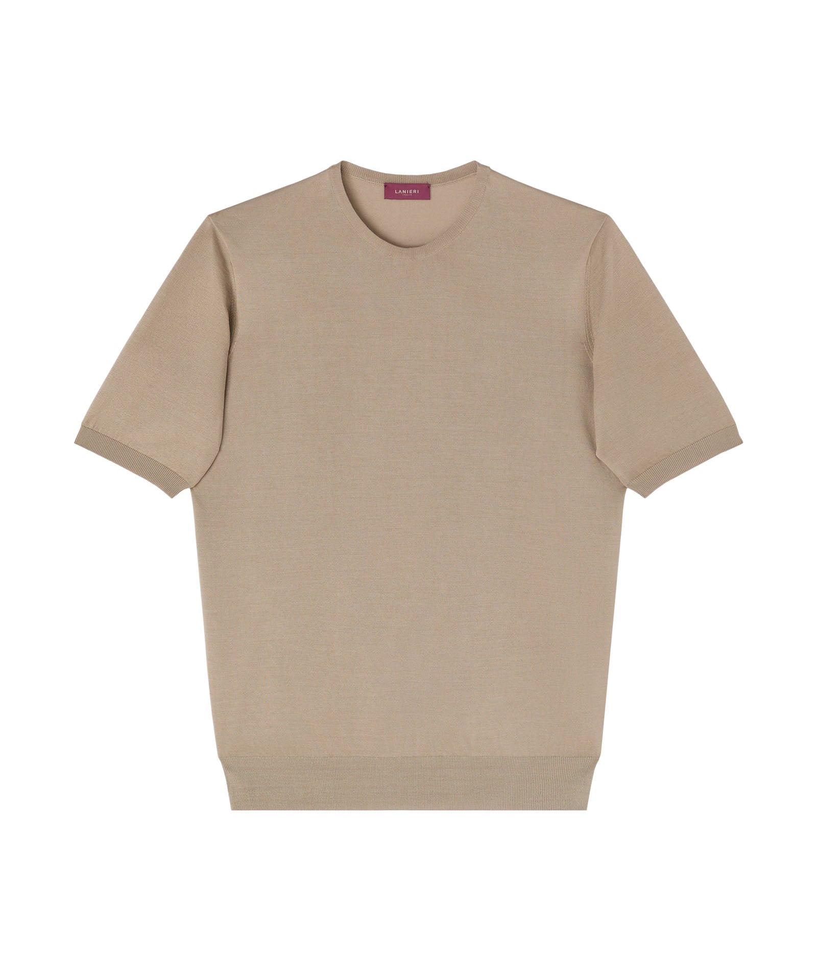 Camiseta de seda y algodón color beis. Un jersey suave, transpirable y con un acabado luminoso gracias a la presencia de la seda. Para llevar debajo de la chaqueta en lugar de una camisa para un look de verano con un toque informal chic.