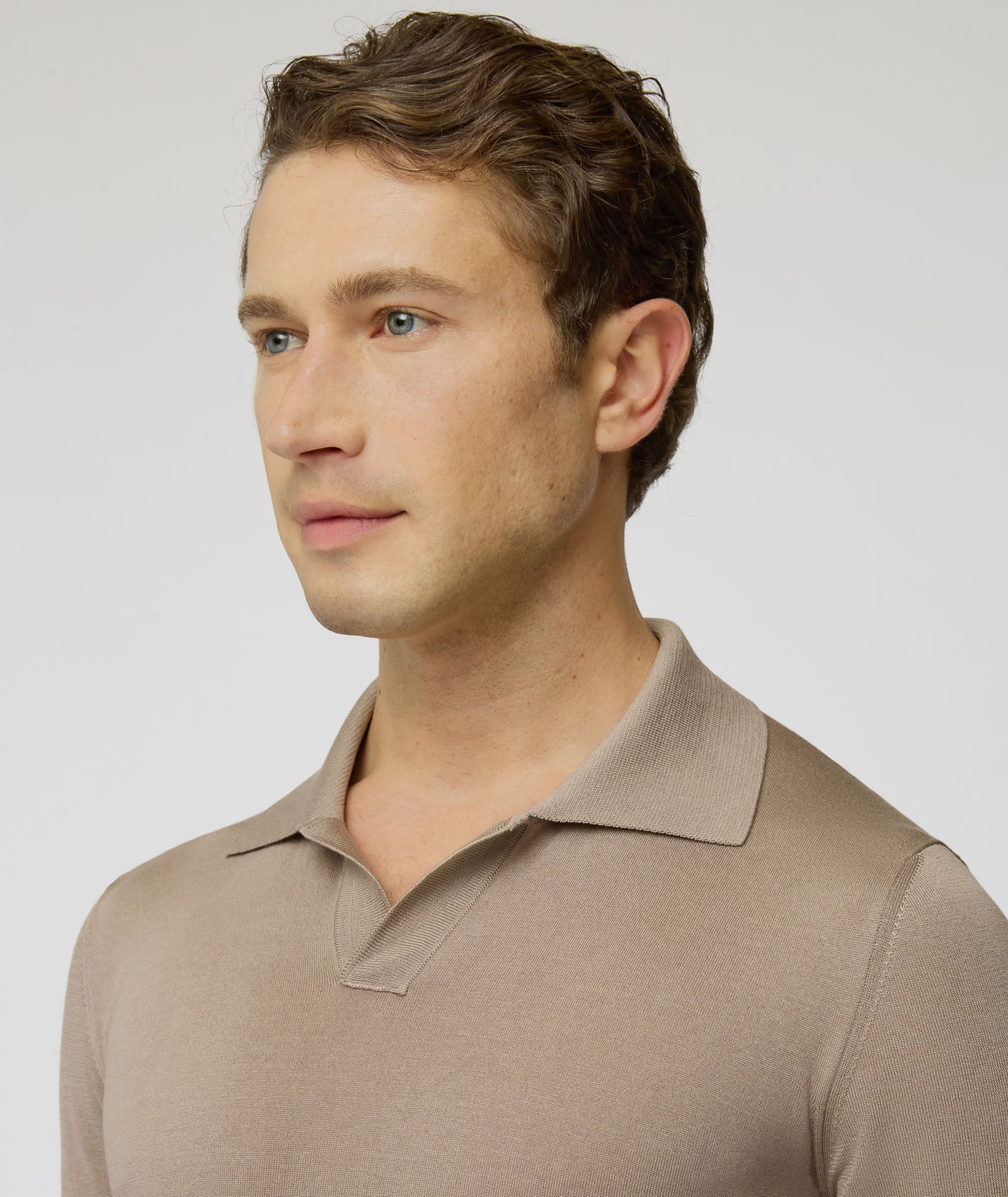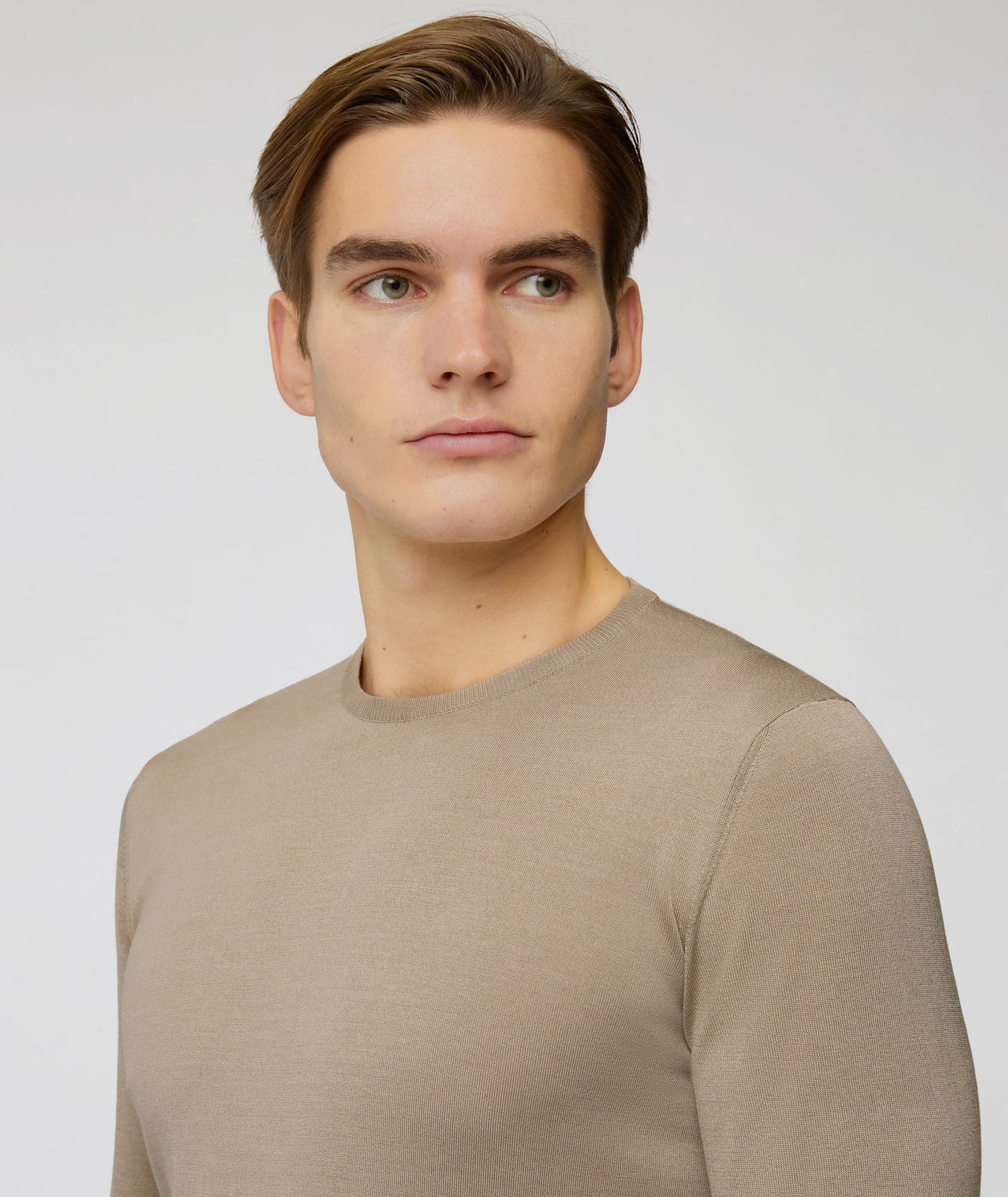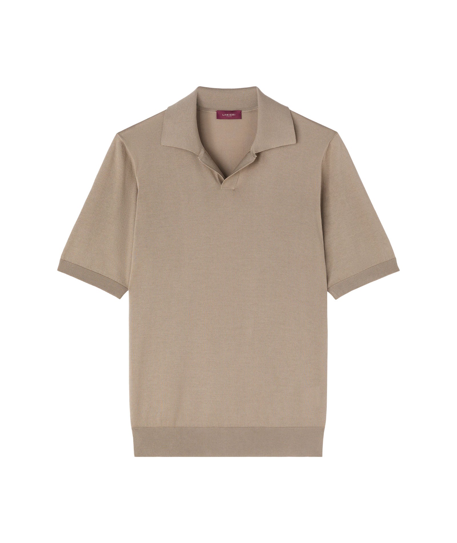 Camiseta de seda y algodón color beis. Un jersey suave, transpirable y con un acabado luminoso gracias a la presencia de la seda. Para llevar debajo de la chaqueta en lugar de una camisa para un look de verano con un toque informal chic.