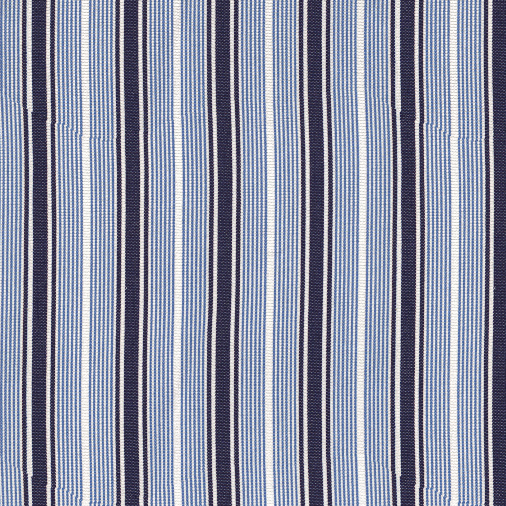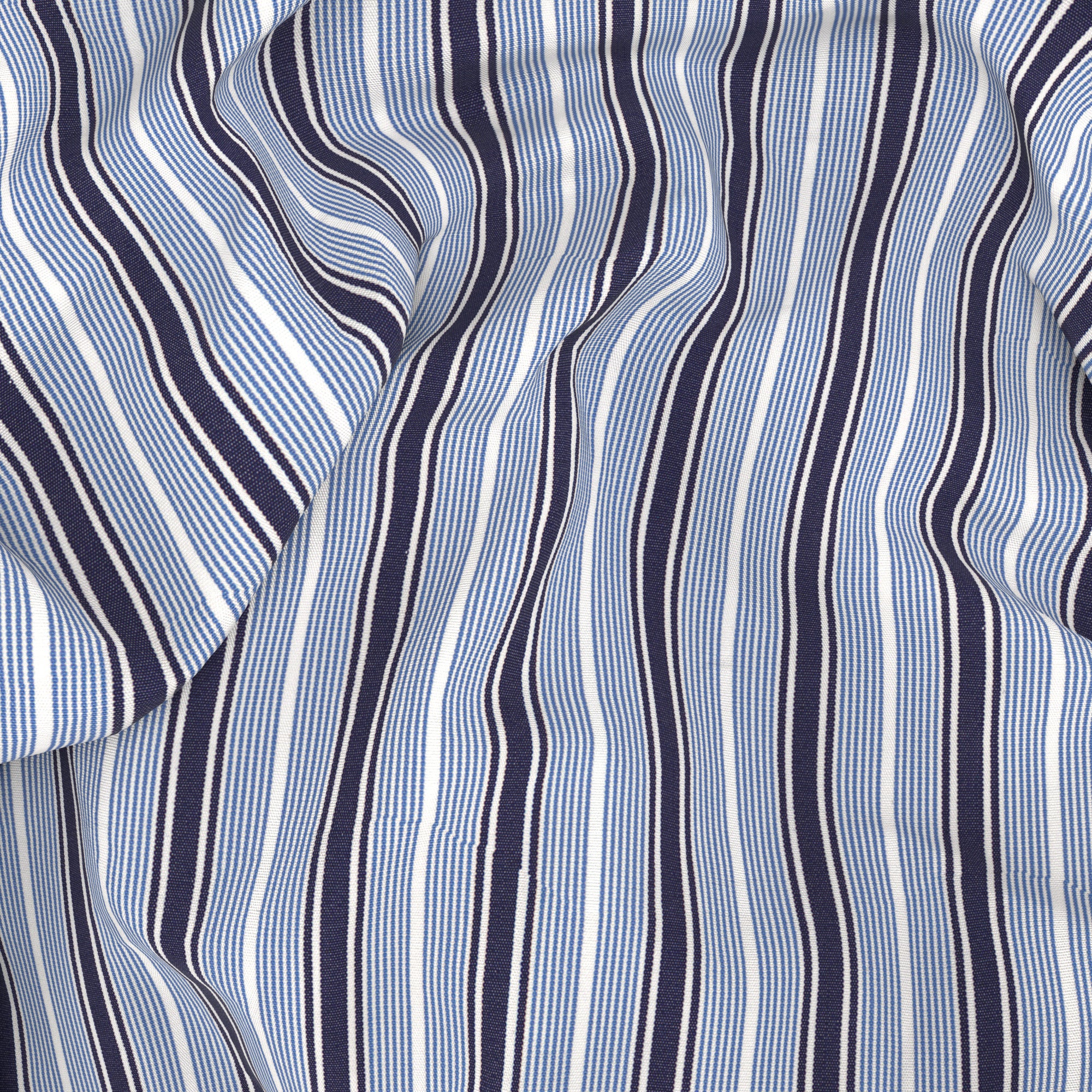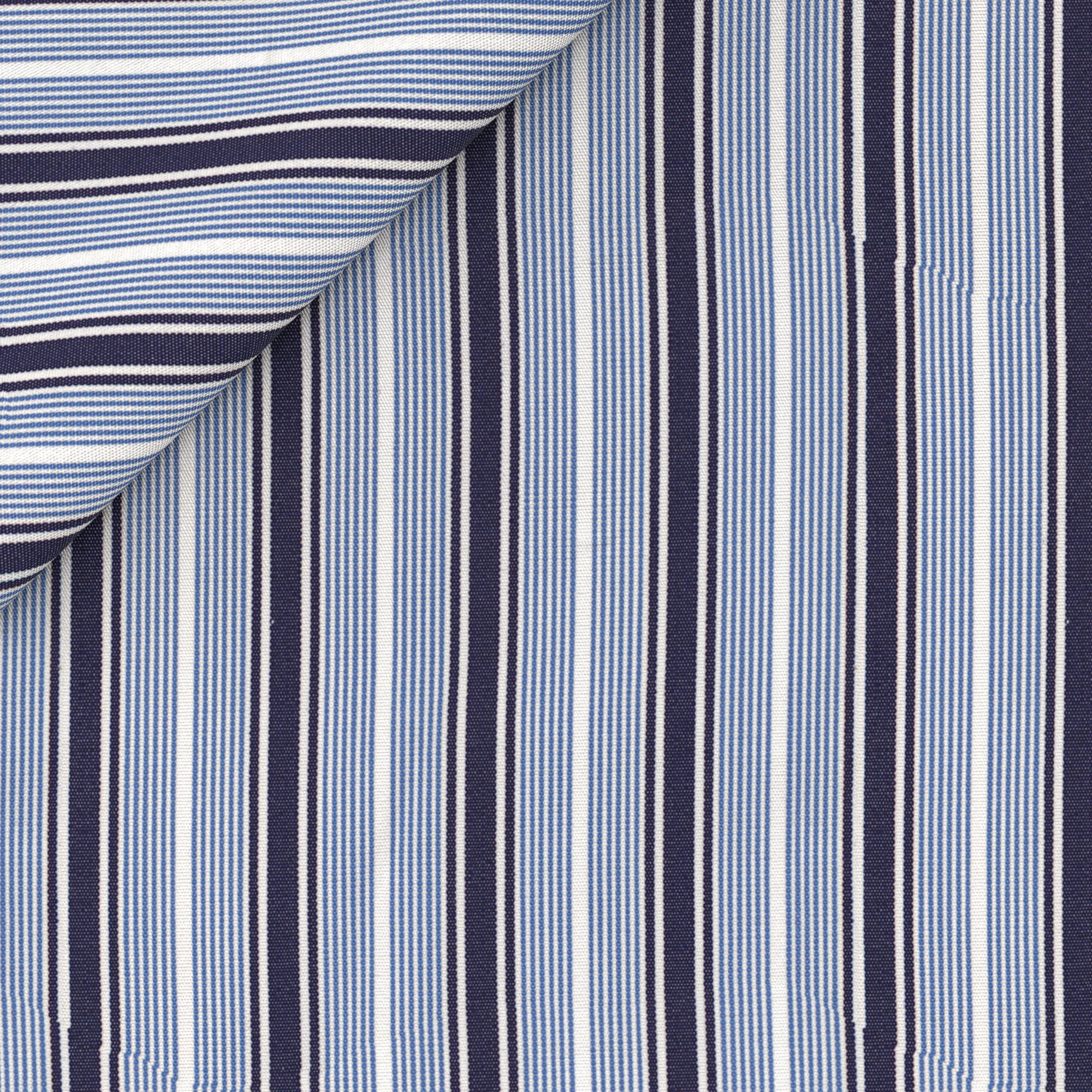 Camicia Su Misura realizzata in cotone di Thomas Mason con una fantasia rigata azzurra e blu. Pensata per i look business, da indossare insieme a giacca e cravatta, come alternativa rispetto alla classica bianca.