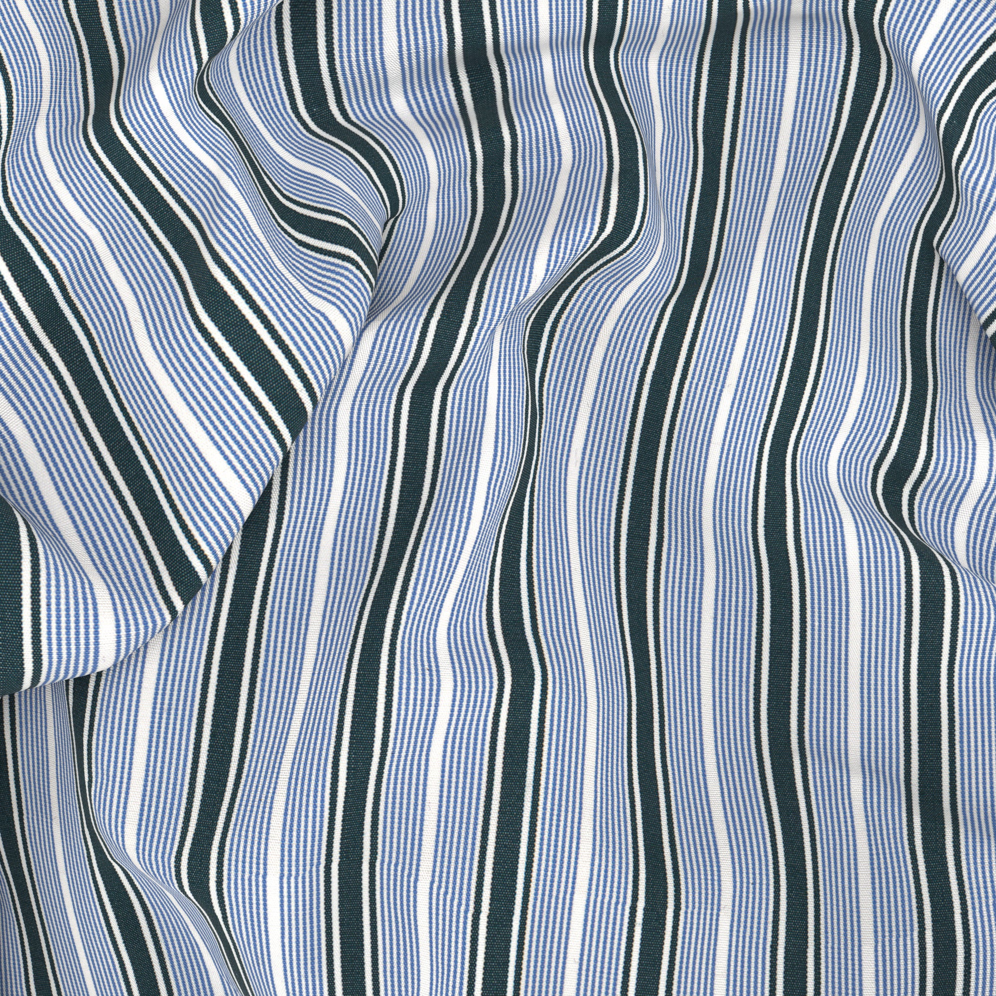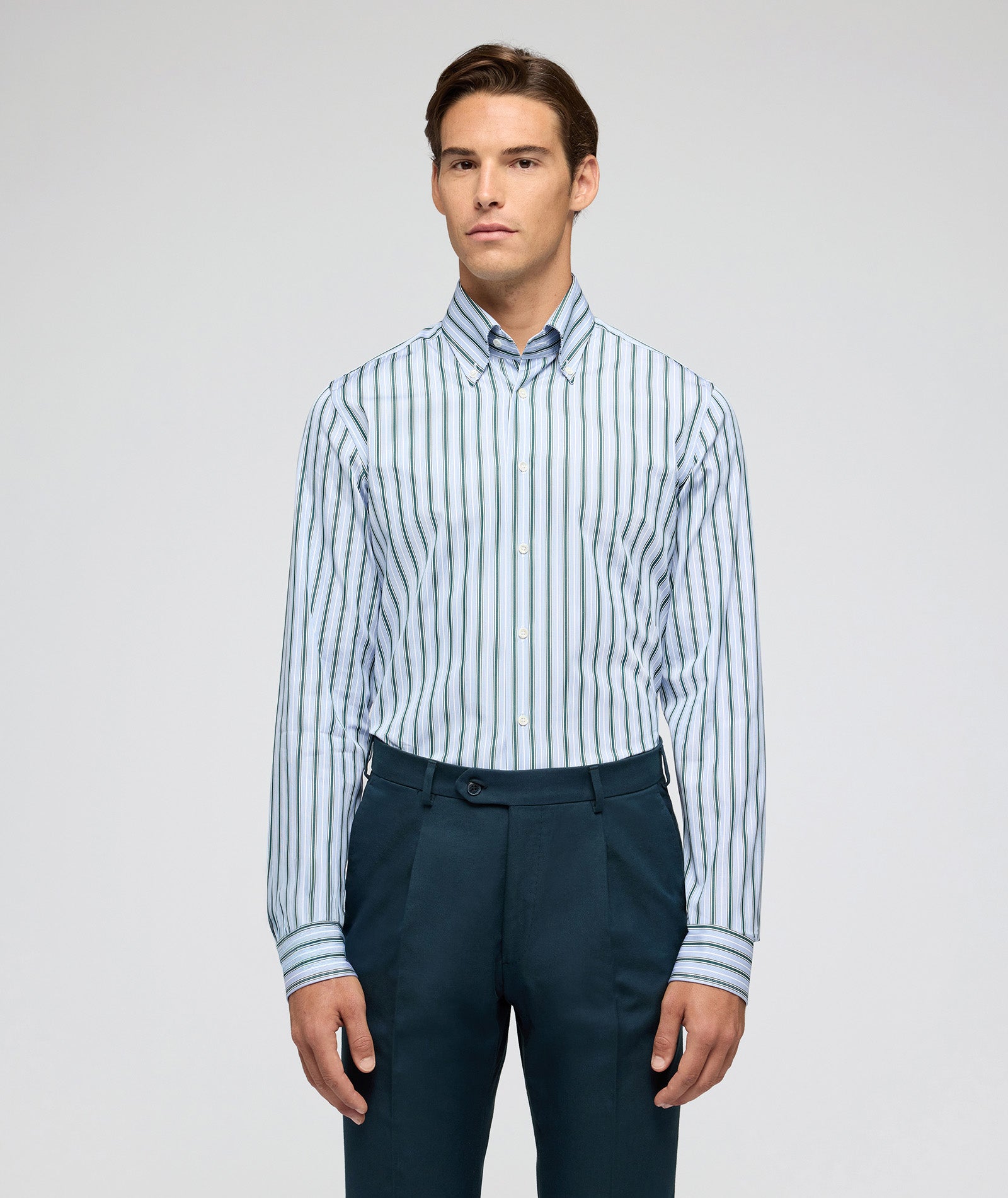 Camicia Su Misura realizzata in cotone di Thomas Mason con una fantasia rigata azzurra e verde. Pensata per i look business, da indossare insieme a giacca e cravatta, come alternativa rispetto alla classica bianca.