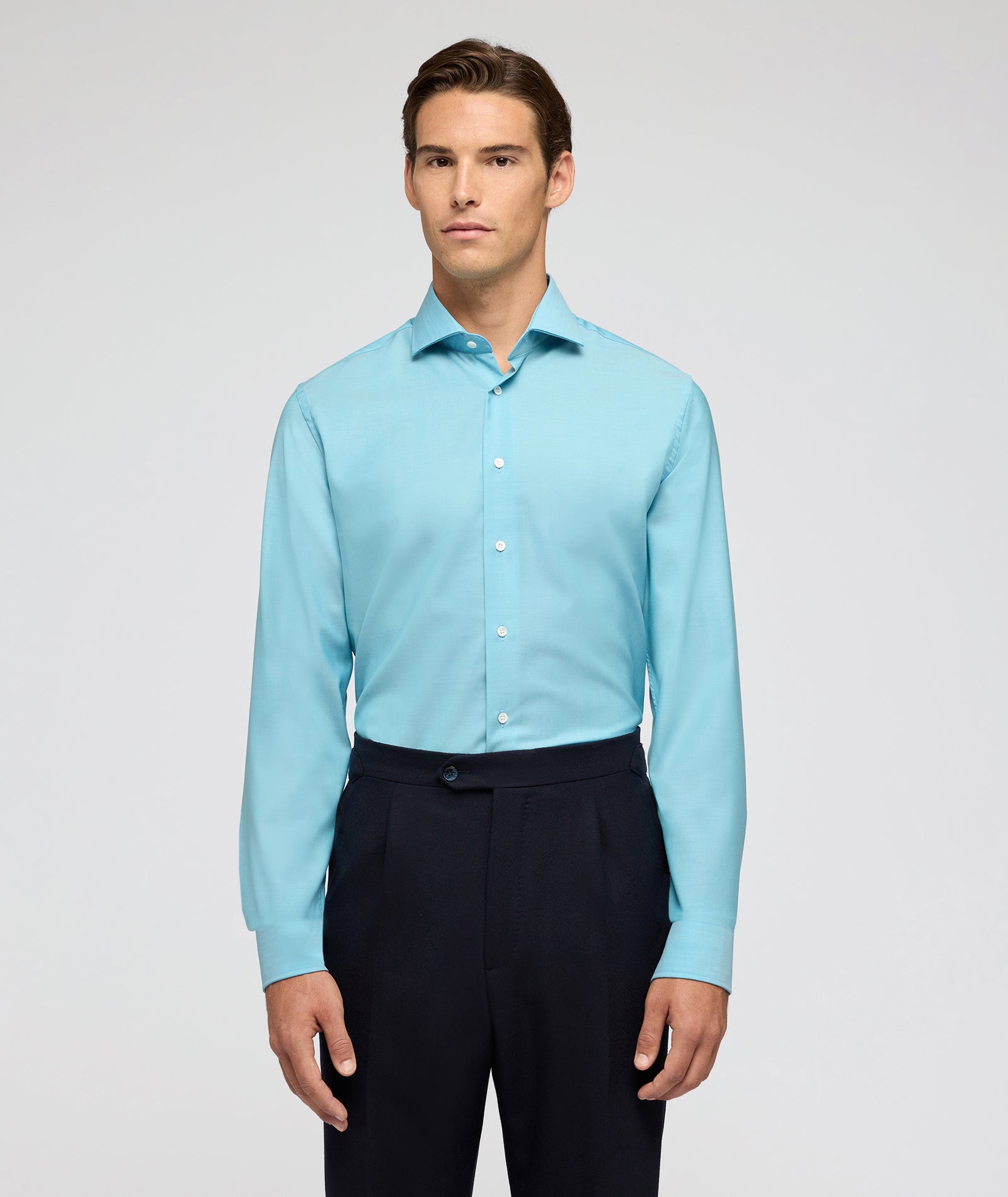Camicia Su Misura in lana e cashmere nei toni dell'azzurro. Il tessuto è del lanificio Reda, linea Reda Active, che si distingue per le alte prestazioni in termini di elasticità e traspirabilità, assicurando un comfort eccezionale.