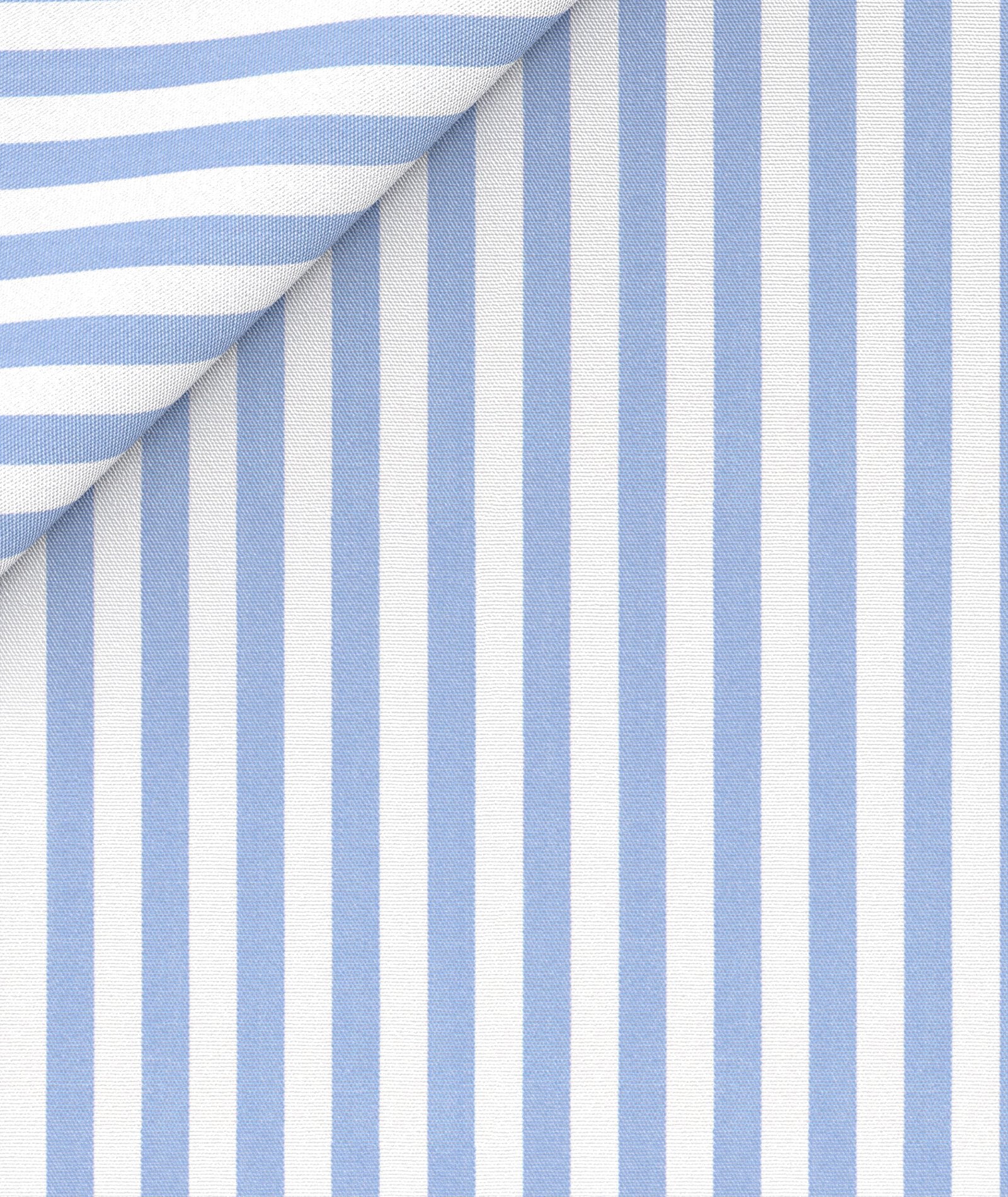 Questa camicia Su Misura è realizzata in Italia con un tessuto in cotone a righe azzurre del cotonificio Alfatex. In 100% popeline di cotone, è una camicia immancabile nel guardaroba di ogni uomo, il complemento perfetto per il classico abito blu da ufficio.
