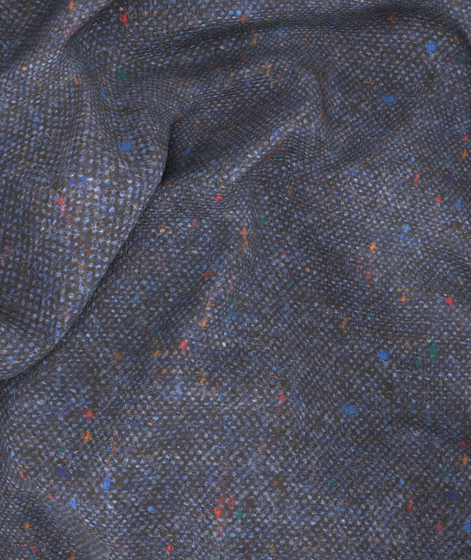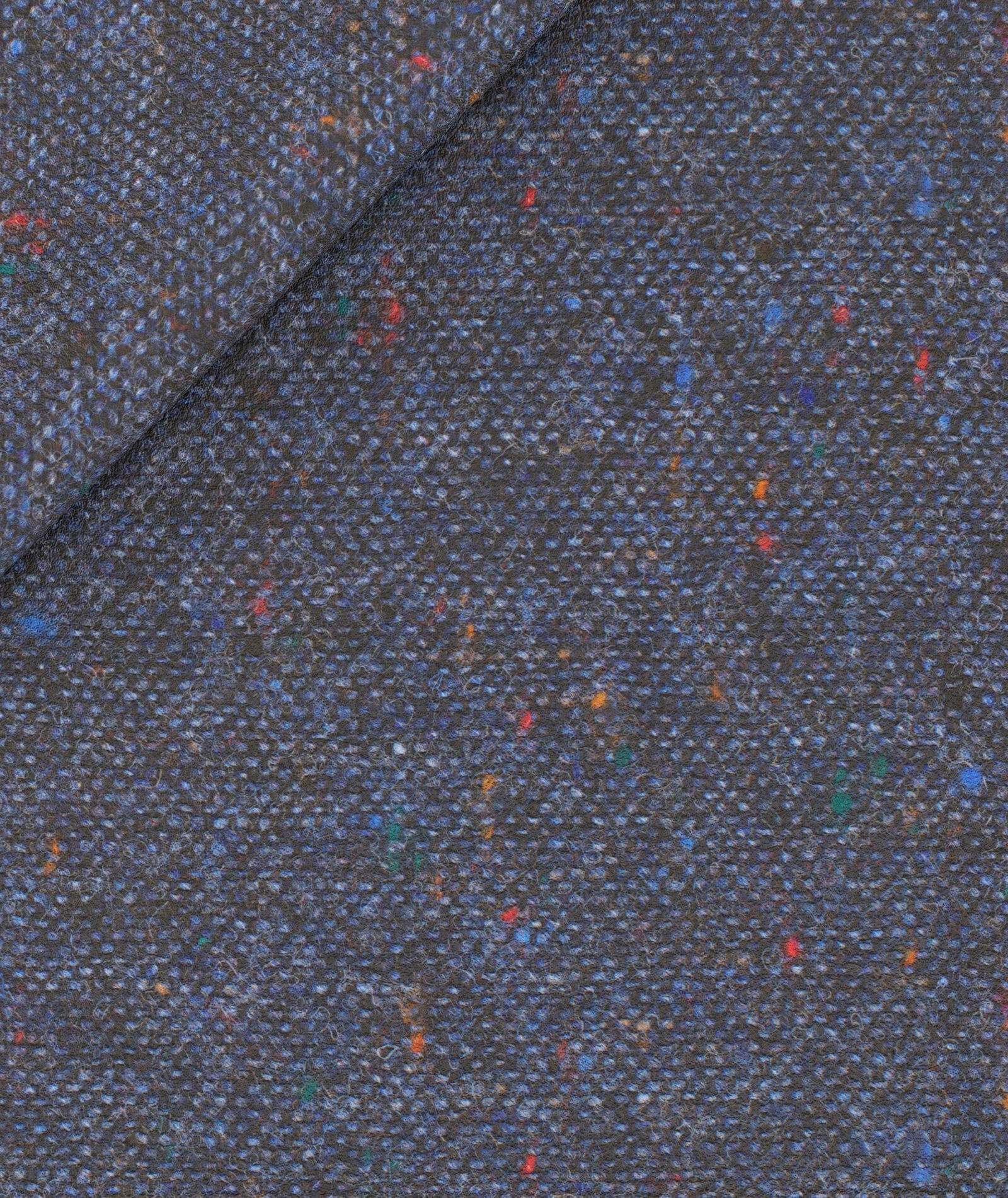 Ce blazer Sur Mesure est réalisé avec un tissu de laine de la manufacture Bottoli. 100% en laine shetland, il offre un aspect plein et consistant caractéristique, avec un toucher légèrement plus rugueux que celui de la laine mérinos, qui définit une allure britannique intemporelle, très recherchée. La technique d’exécution knickerbocker - qui consiste à ajouter des bouts de laine d’autres couleurs qui crée l’effet multicolore - illumine la base bleue. Le résultat est un vêtement raffiné parfait pour les temps libres.