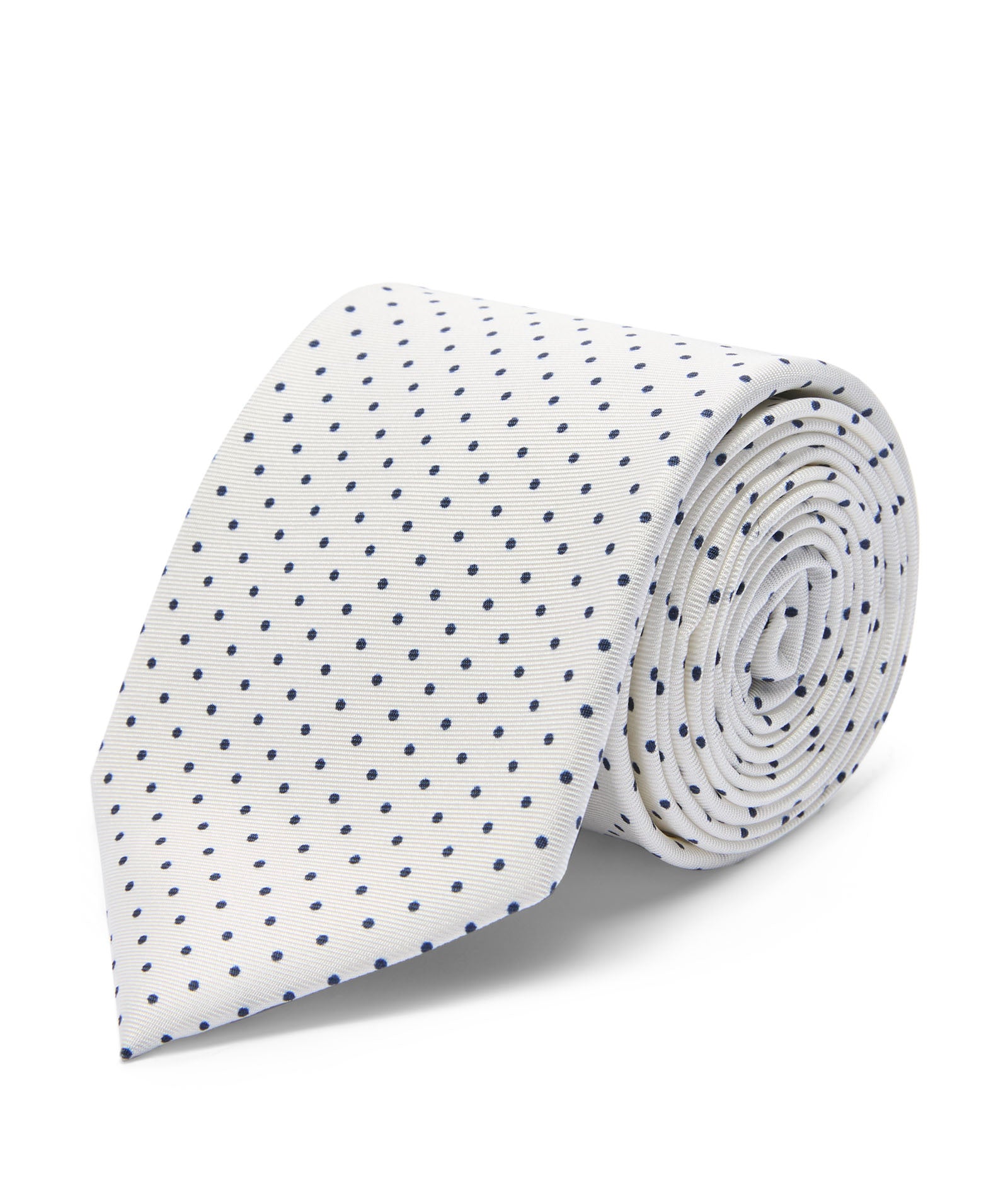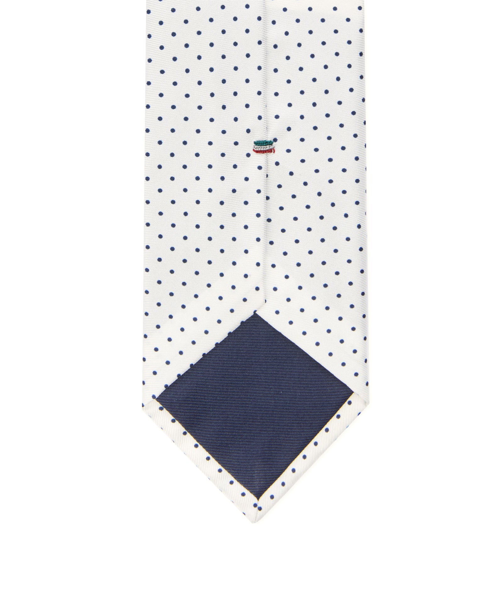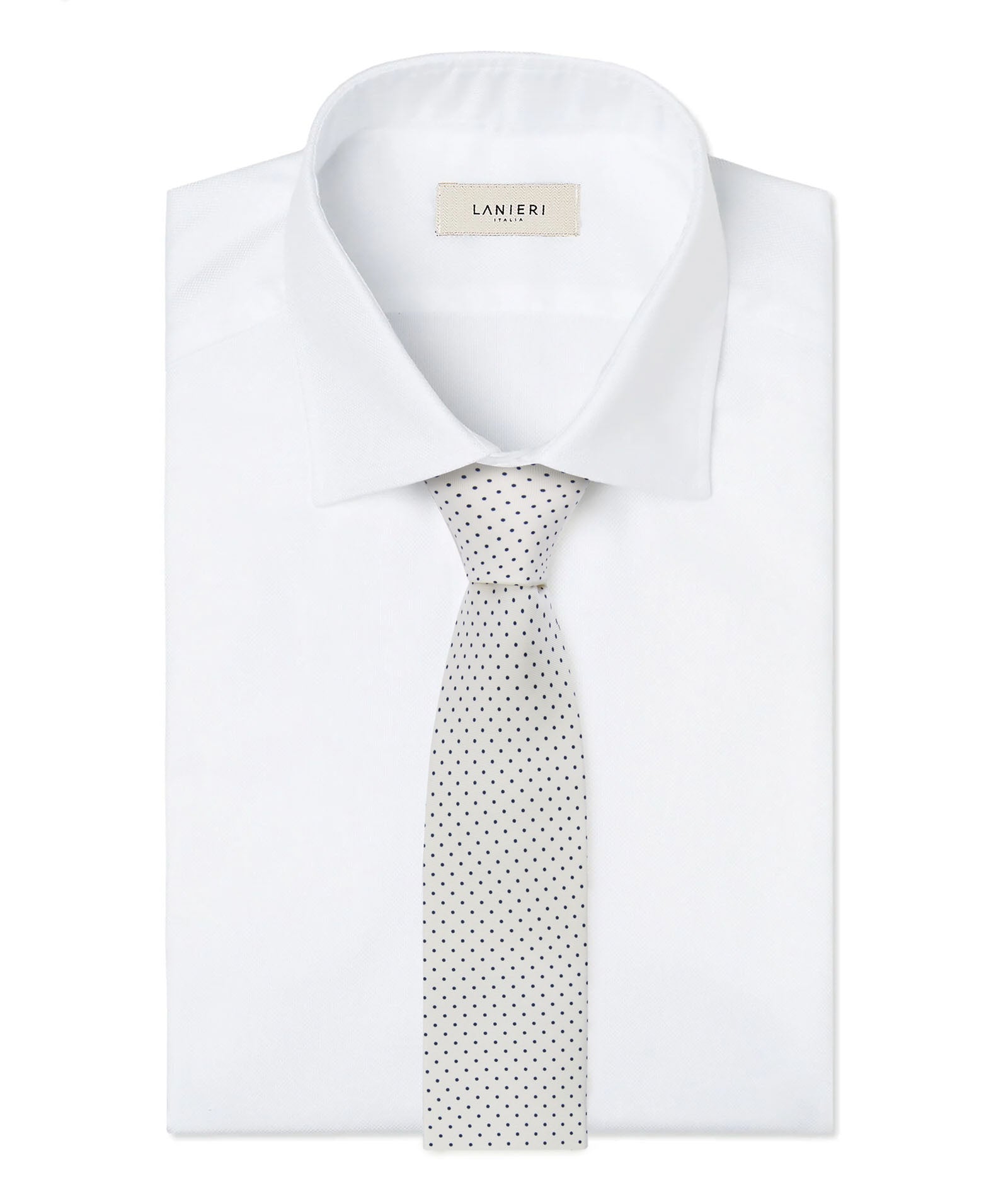 Cravate réalisée en 100% soie en Italie. Caractérisée par un motif à pois sur fond blanc qui la rend versatile, parfaite pour être portée avec un costume formel au bureau ou avec un complet dépareillé pour les occasions élégantes mais plus décontractées. Personnalisable pour un style vraiment unique.