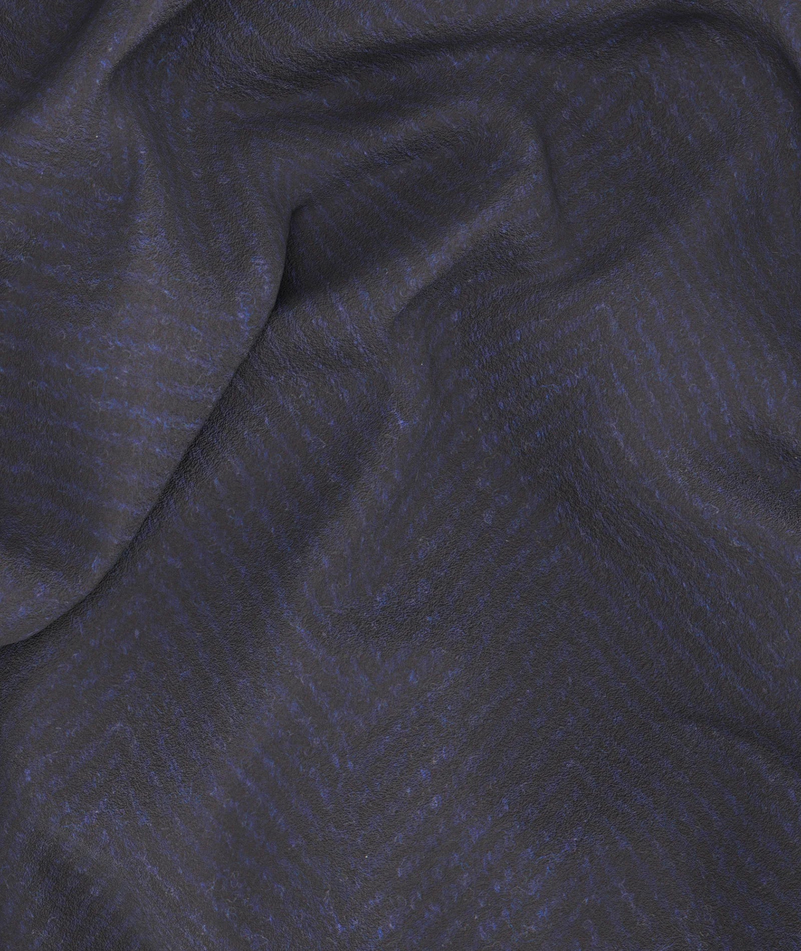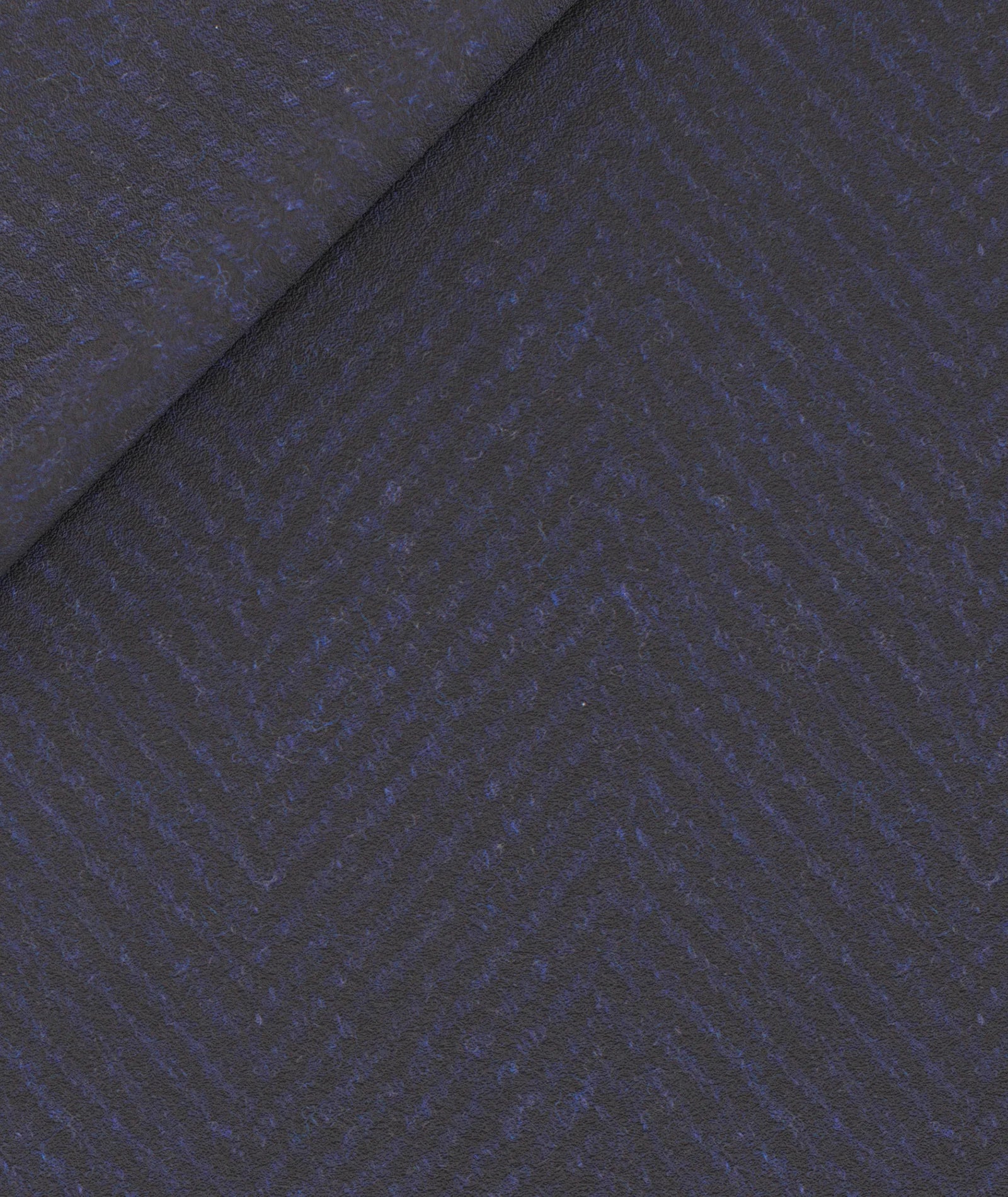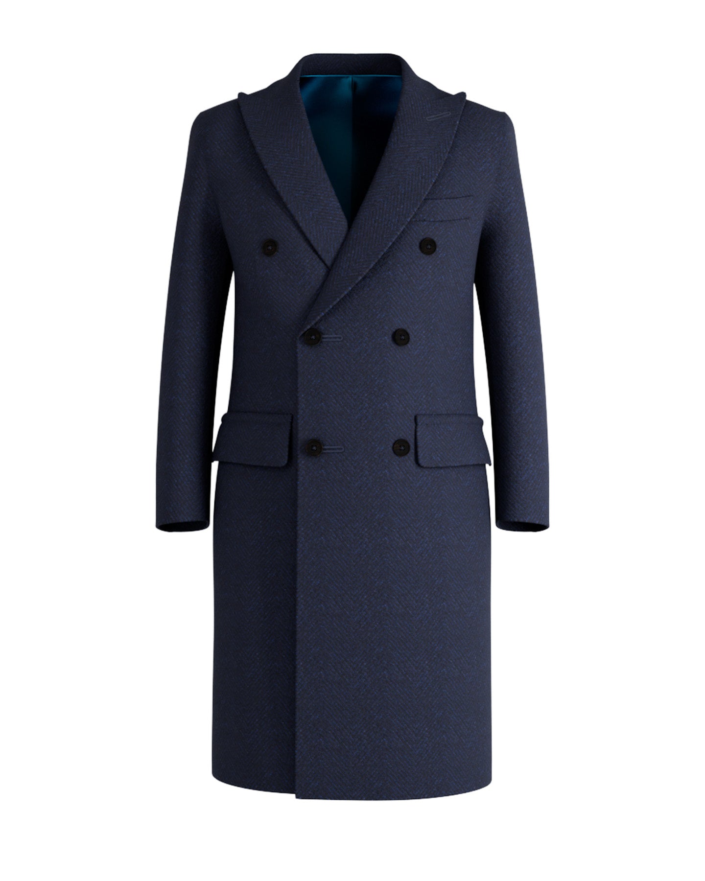 Manteau Sur Mesure en laine et cachemire de la filature Drago. Caractérisé par un toucher doux et enveloppant, il arbore un motif à chevrons dans des tons bleu foncé rehaussés d’accents plus clairs conférant ainsi une brillance distinctive au vêtement. À porter sur un costume pour les occasions professionnelles.
