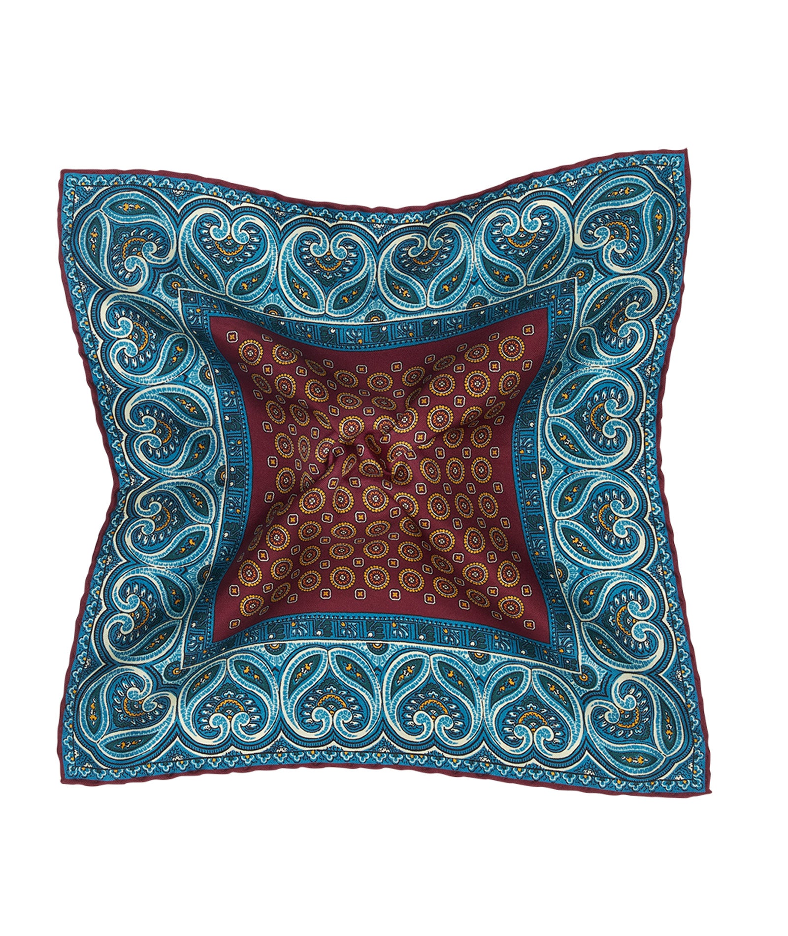 Pochette en soie à motifs cachemire et médaillons dans les tons bleus et jaunes. De forme carrée, c'est un accessoire à porter avec nonchalance dans la poche d'un blazer.