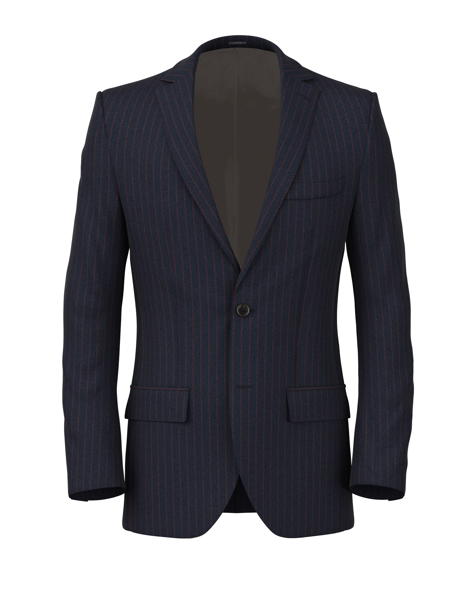 Veste réalisée Sur Mesure en flanelle de laine de la manufacture de laine Reda. Dans des tons bleus classiques, elle est égayée par de fines rayures rouges qui ajoutent une touche lumineuse au vêtement. À porter en hiver, lors des journées plus froides, avec une chemise et une cravate ou avec un col roulé pour une touche plus informelle, même au bureau.