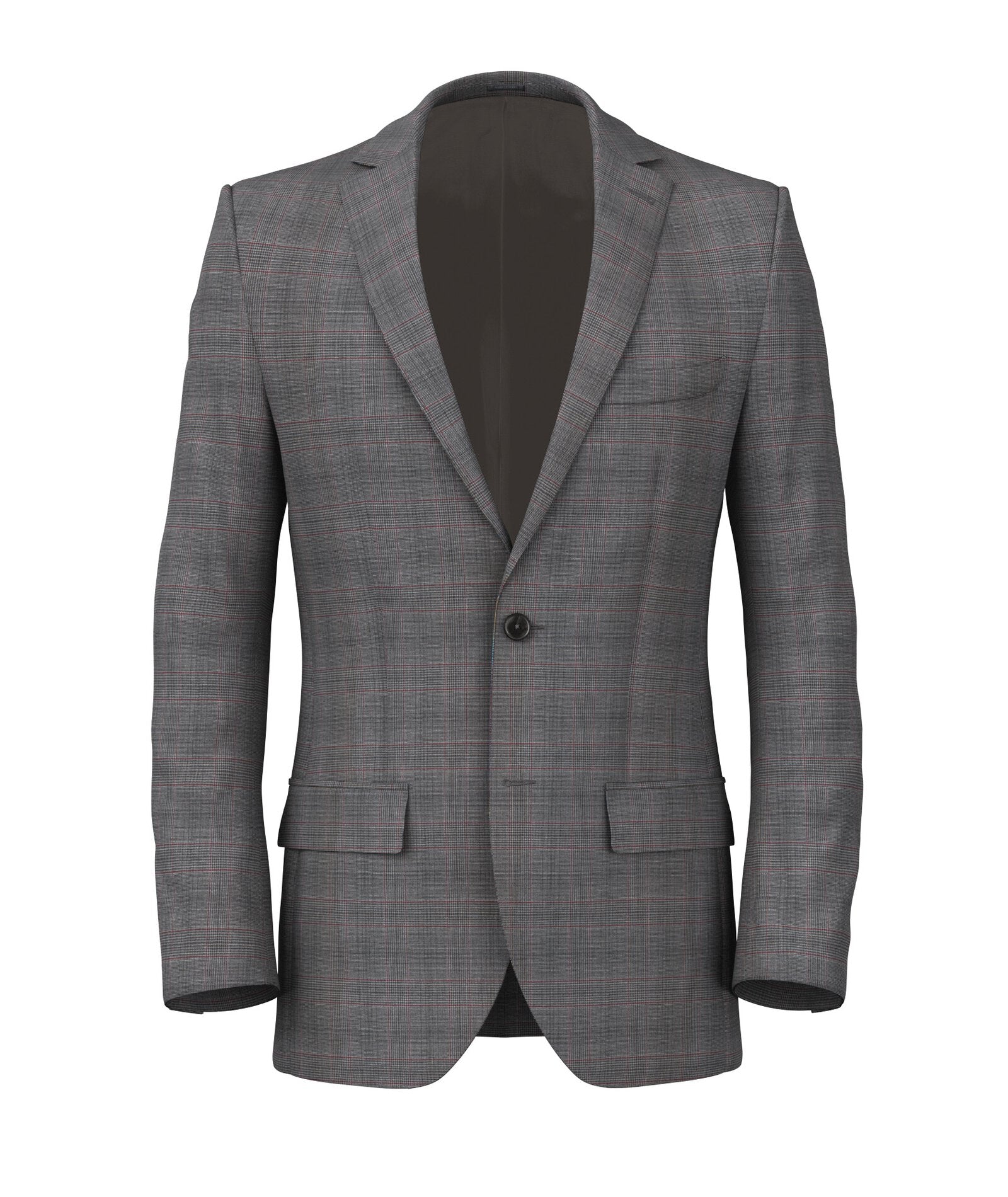 Polyvalente et délicate au toucher, cette veste de tailleur sur mesure grise à bordure bordeaux est en pure laine mérinos. Naturellement élastique, elle garantit un confort et une mise en pli toujours impeccable, assurant légèreté et fraîcheur à celui qui la porte. Elle est particulièrement adaptée à la saison la plus chaude.